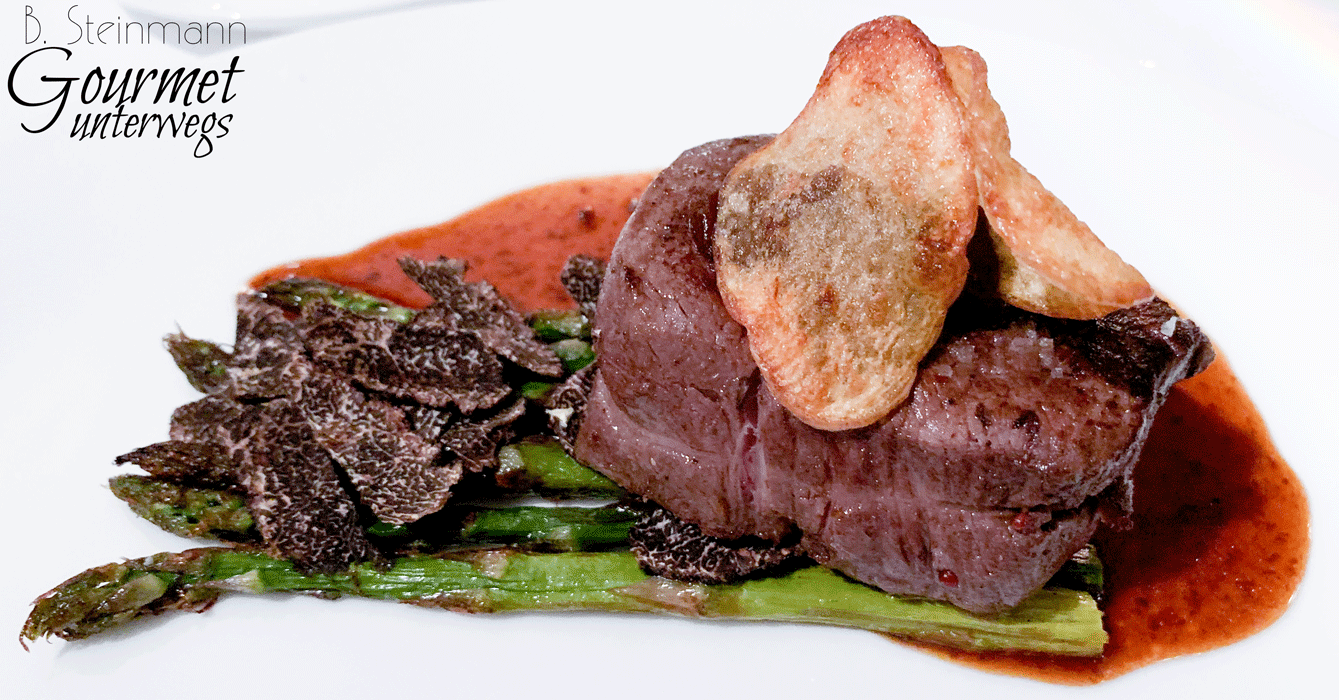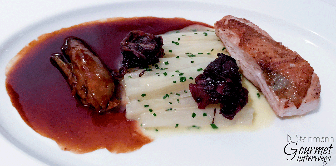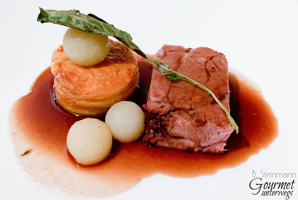 Die Küchenchefin beschreibt im Interview, das in wenigen Tagen an gleicher Stelle veröffentlicht wird, ihren Küchenstil als klassisch mit modernen Elementen. Dies trifft auch auf das vor uns stehende Gericht zu. Die ebenfalls von ihr erwähnte Puristik ist allerdings hier nicht zu erkennen. Das ist auch gut so. Denn Bergheims Kreationen sind für Gäste, die sich noch am Genuss erfreuen können.