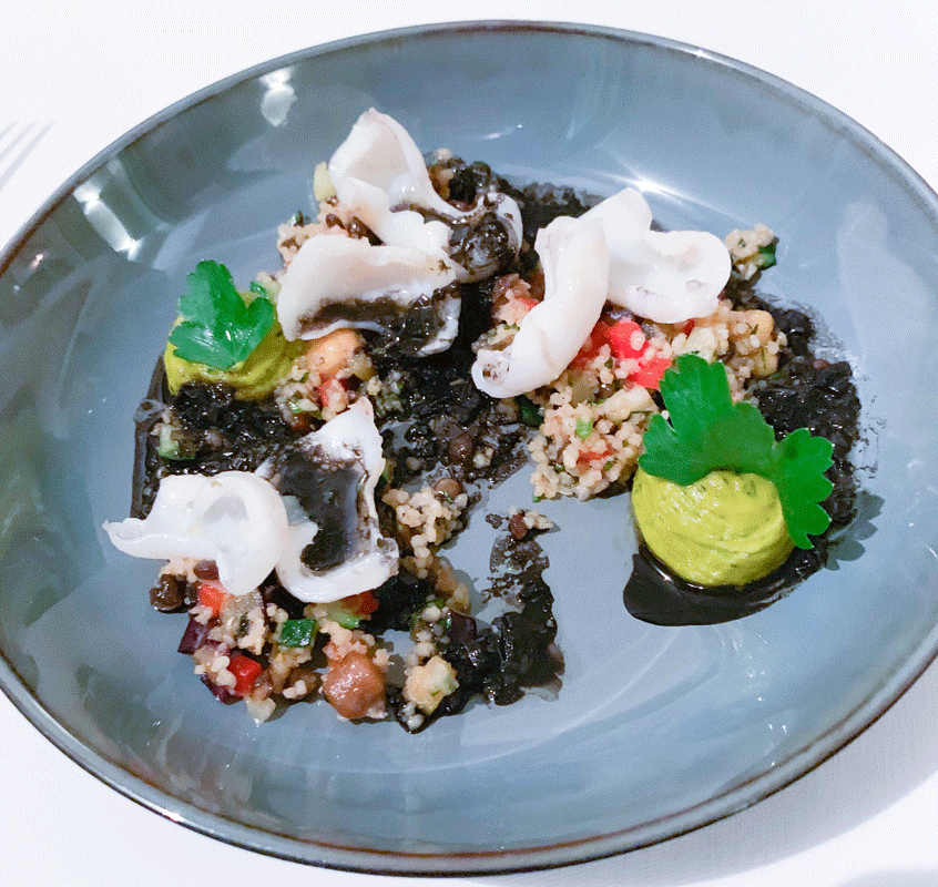 Erika Bergheim schickt den schmackhaften Tintenfisch mit interessanten Begleitern zu den Gästen. In der Summe ergibt dies ein überaus leichtes, sehr harmonisches und aromatisches Gericht.