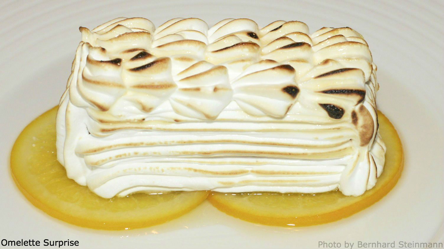 Eine Joconde, getränkt mit einem Grand Manier Sirup- Holunderblüteneis, Erdbeeren und Pfirsichsorbet. Das Ganze ist mit einem italienischen Baiser bedeckt, das zuerst karamelisiert und dann flambiert wird.