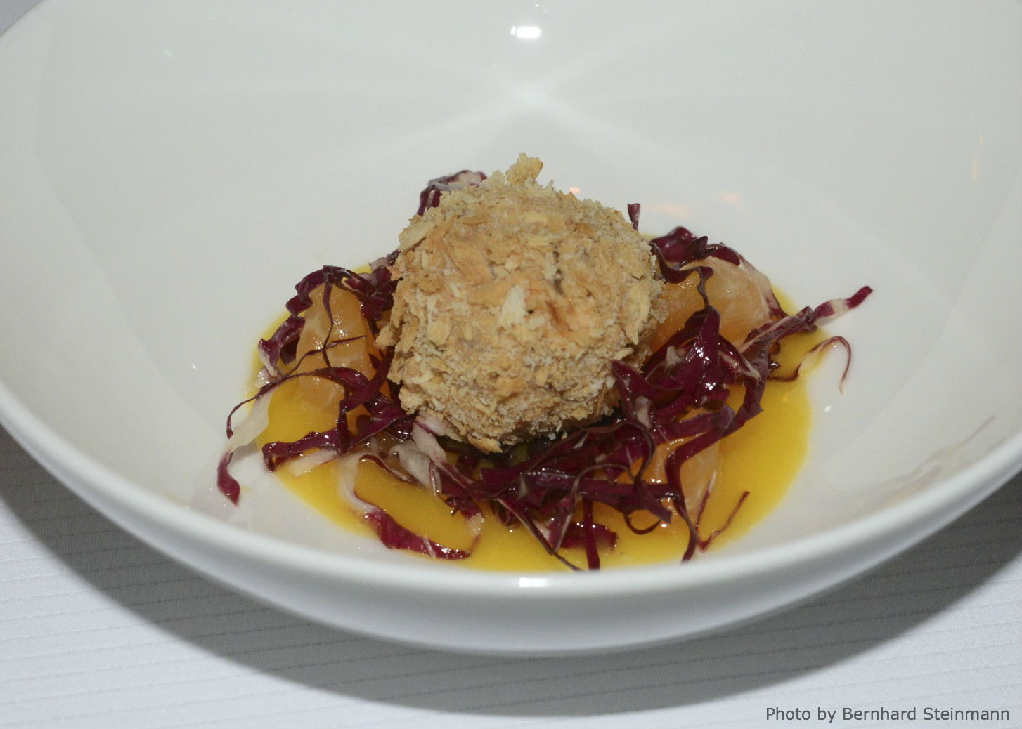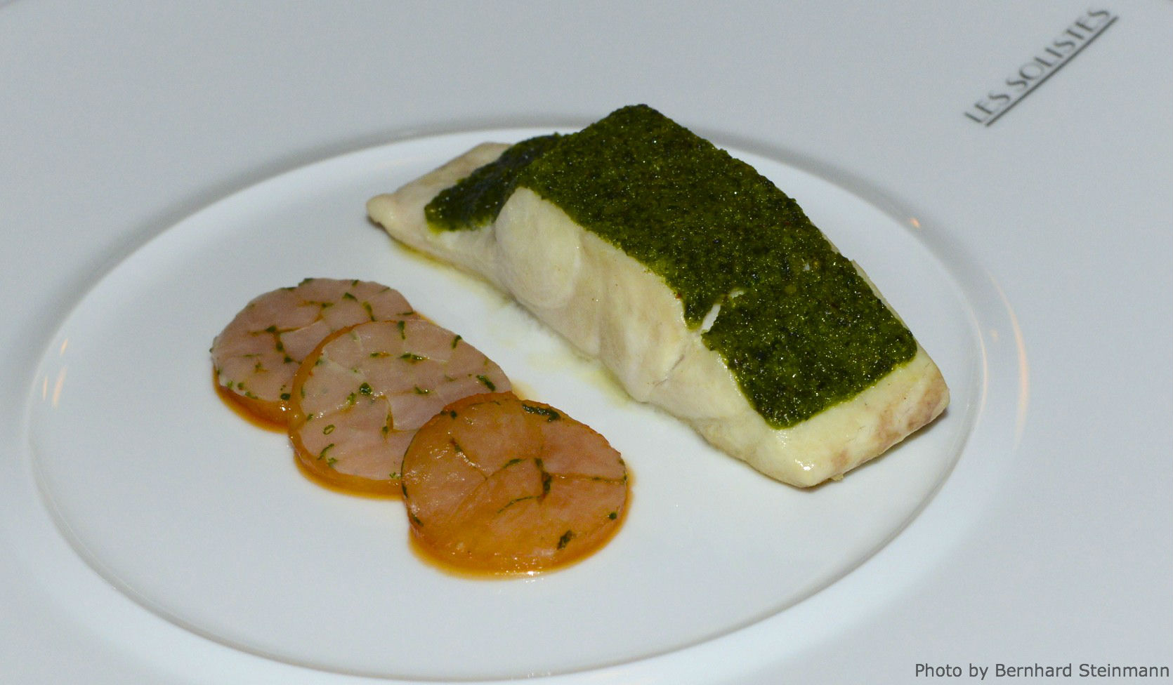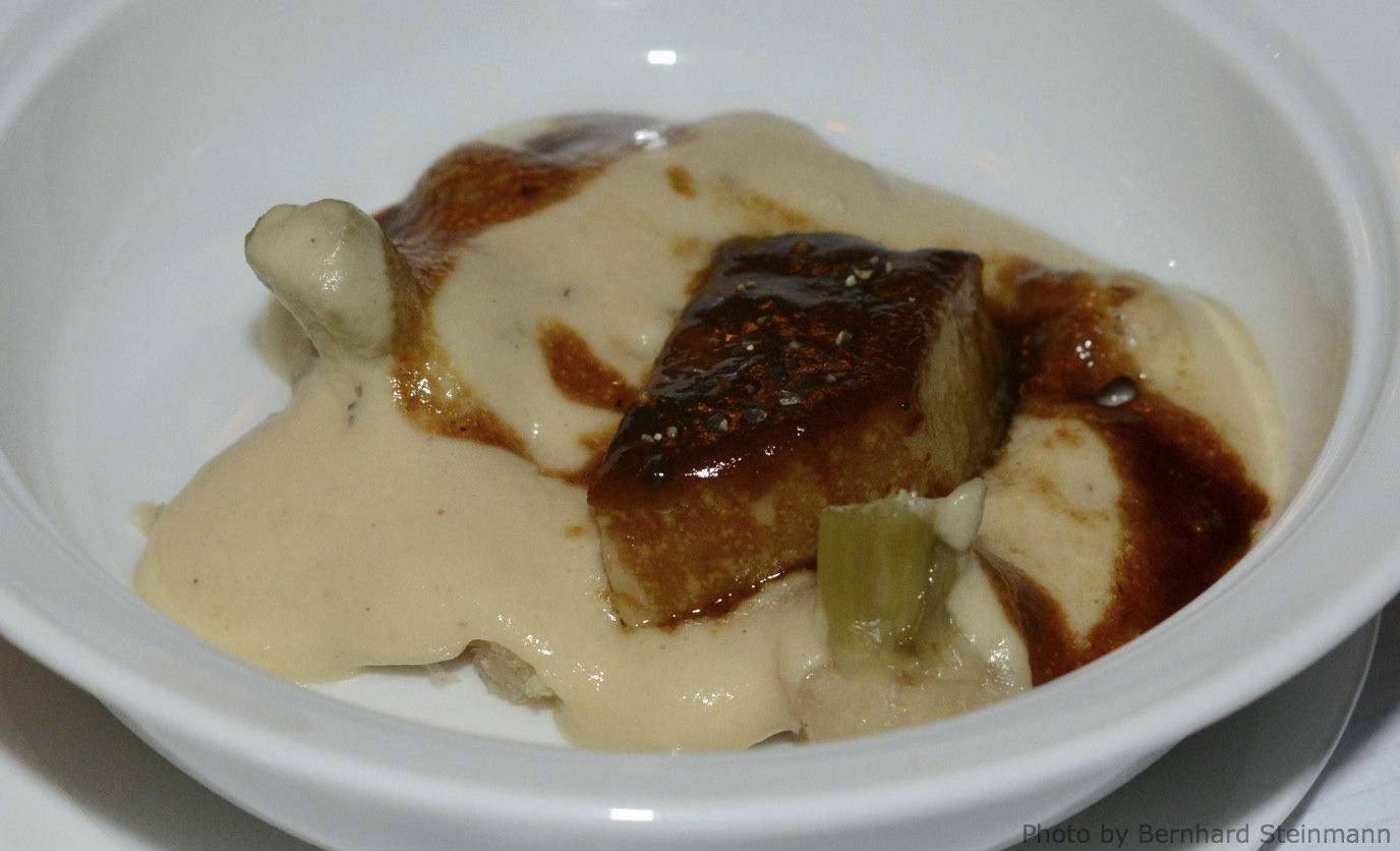 Das weiße, feinfaserige und erkennbar gut strukturierte Fleisch des zu den barschartigen Fischen zählenden Wasserbewohners war perfekt gegart und von außergewöhnlicher Qualität. Die Kräuterkruste vermittelt angenehme Würze, welche perfekt mit der Säure der Zitrusbutter harmoniert. Topinambur, oftmals auch als Rosskartoffel bezeichnet, ergänzt und vollendet.
