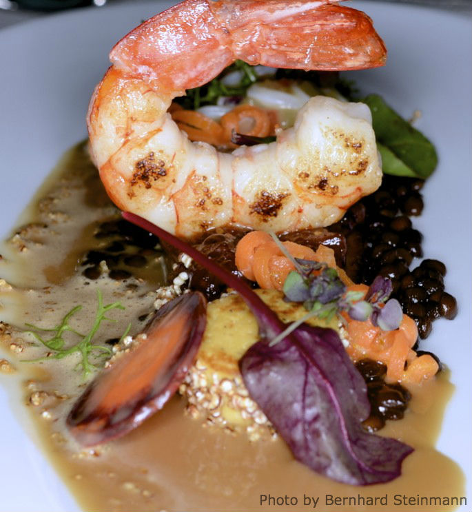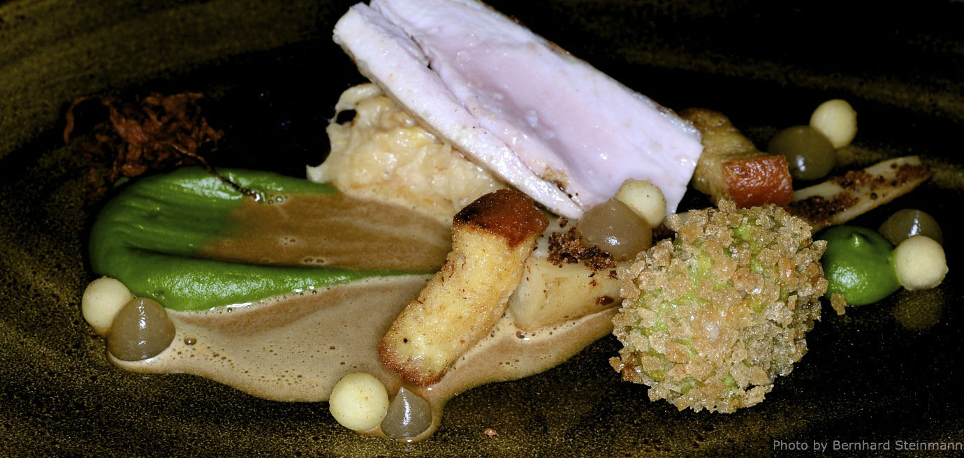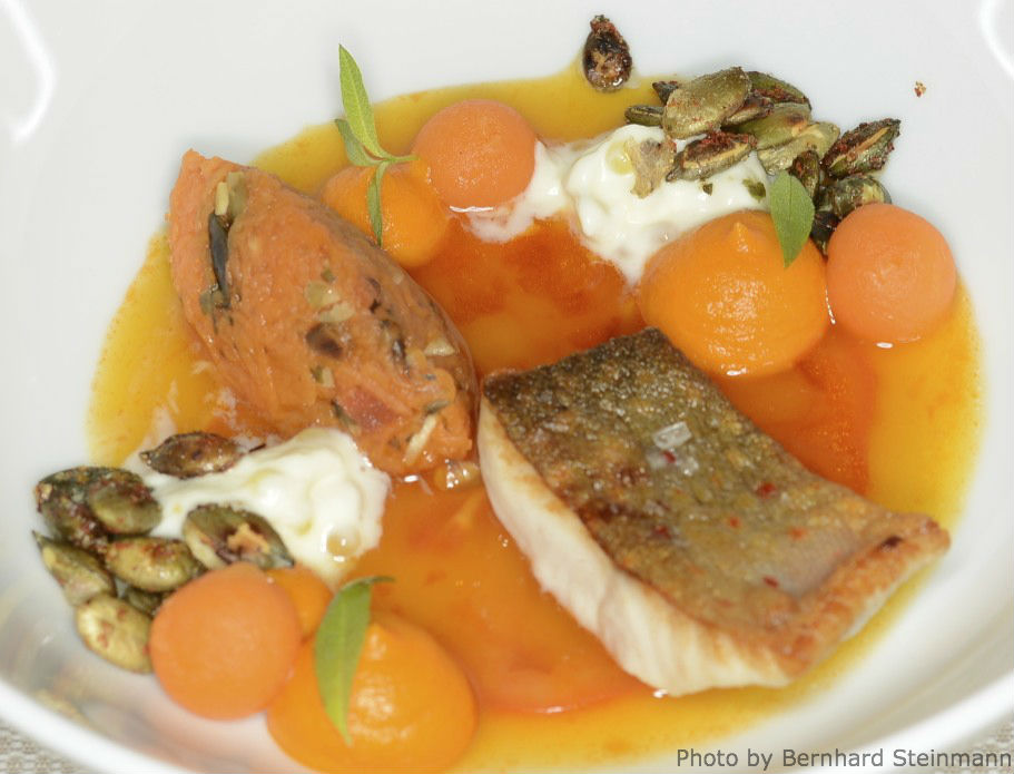 Die Jakobsmuschel ist von hervorragender Qualität. Sowohl gebraten als auch mariniert sehr überzeugend. Können wir die Beigabe Sesam vernachlässigen, setzt sich das Bananenaroma teils aufdringlich in Szene, auch wenn diese Vorherrschaft nicht lange besteht. Der nussige und leicht süssliche Geschmack der Muschel kommt kaum zur Geltung.