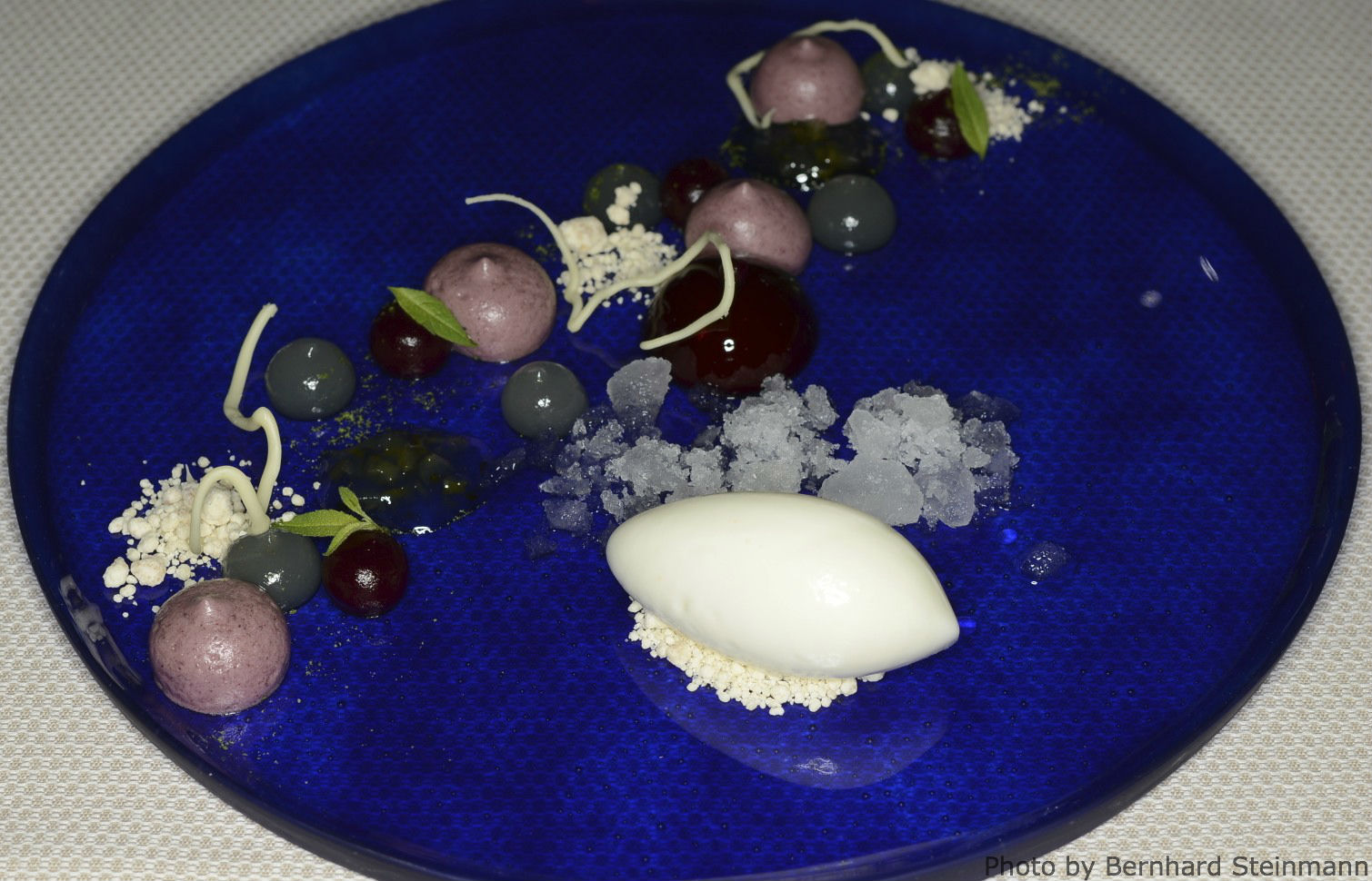 Als Zwischengang gibt es ein erfrischendes Gurkensorbet mit Heidelbeeren und Ginschaum (o.A.)