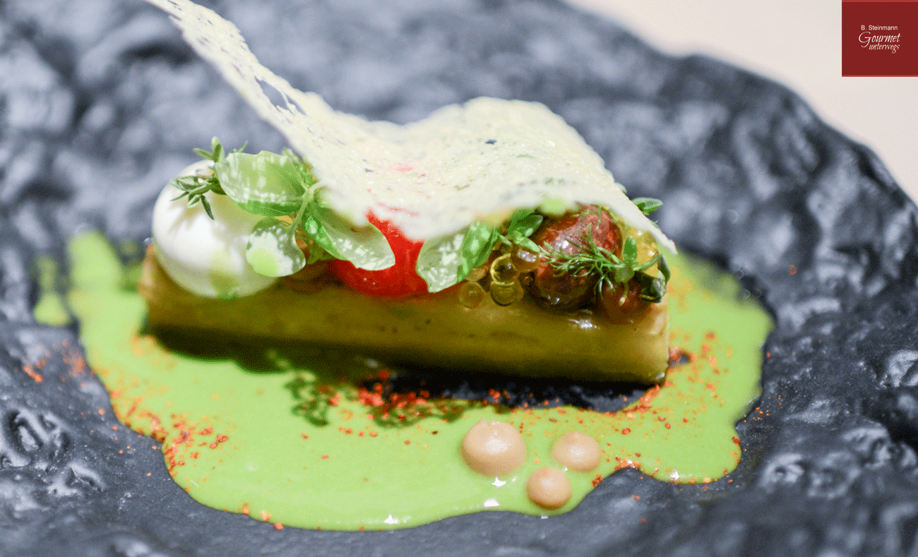 Ein besonderer A-ha-Effekt geht von der Kombination mit Aubergine und grünem, mit dezenter Schärfe ausgestatteten Gazpacho aus. Es scheint gewagt, dem Gast ein solch stattliches Stück vom fetten Speck zuzumuten ohne sogleich mit der Spirituosenflasche an der Tischkante zu stehen. Doch erstaunt die Kombination besonders dadurch, dass sich die einzelnen Bestandteile prächtig ergänzen und geschmacklich harmonieren.