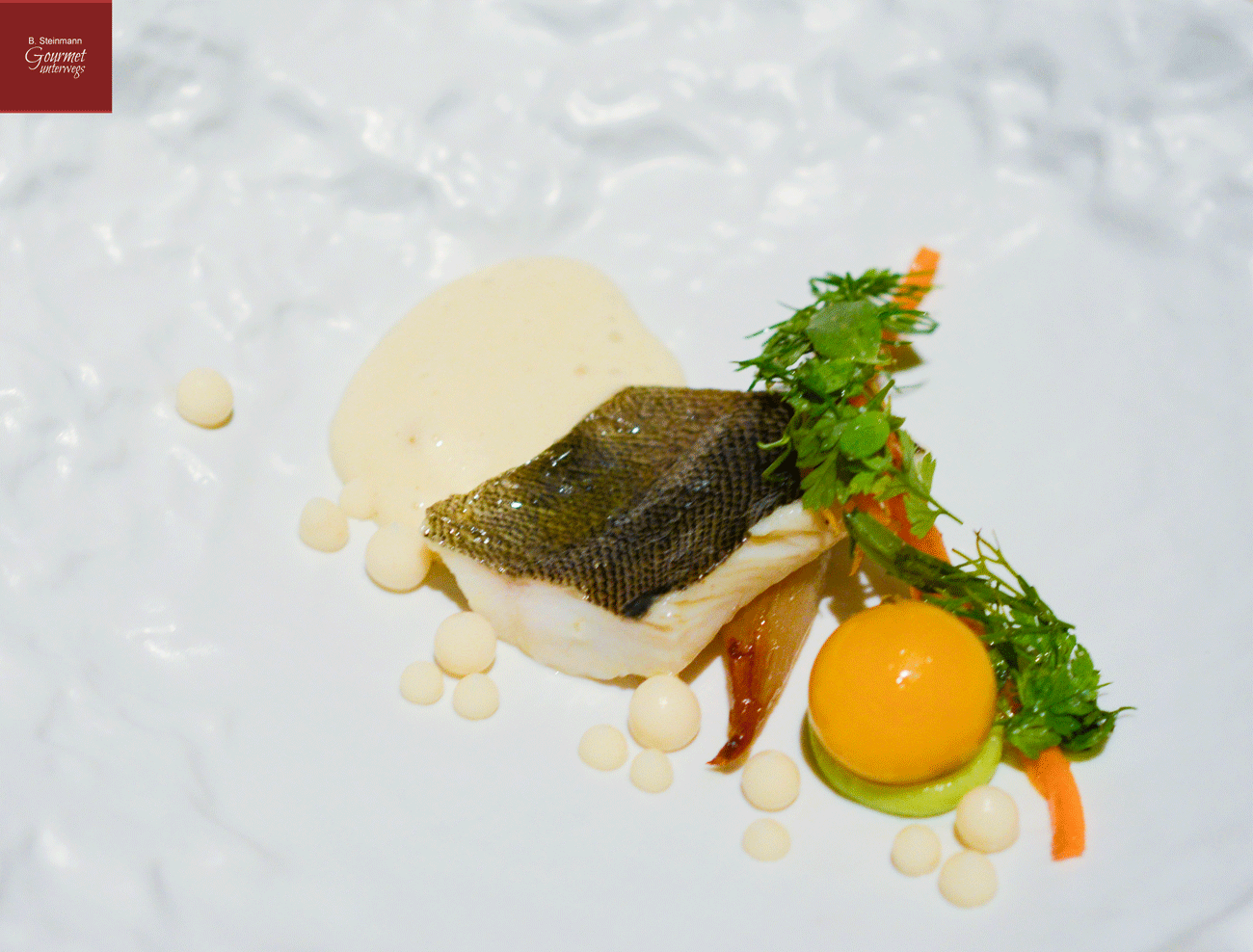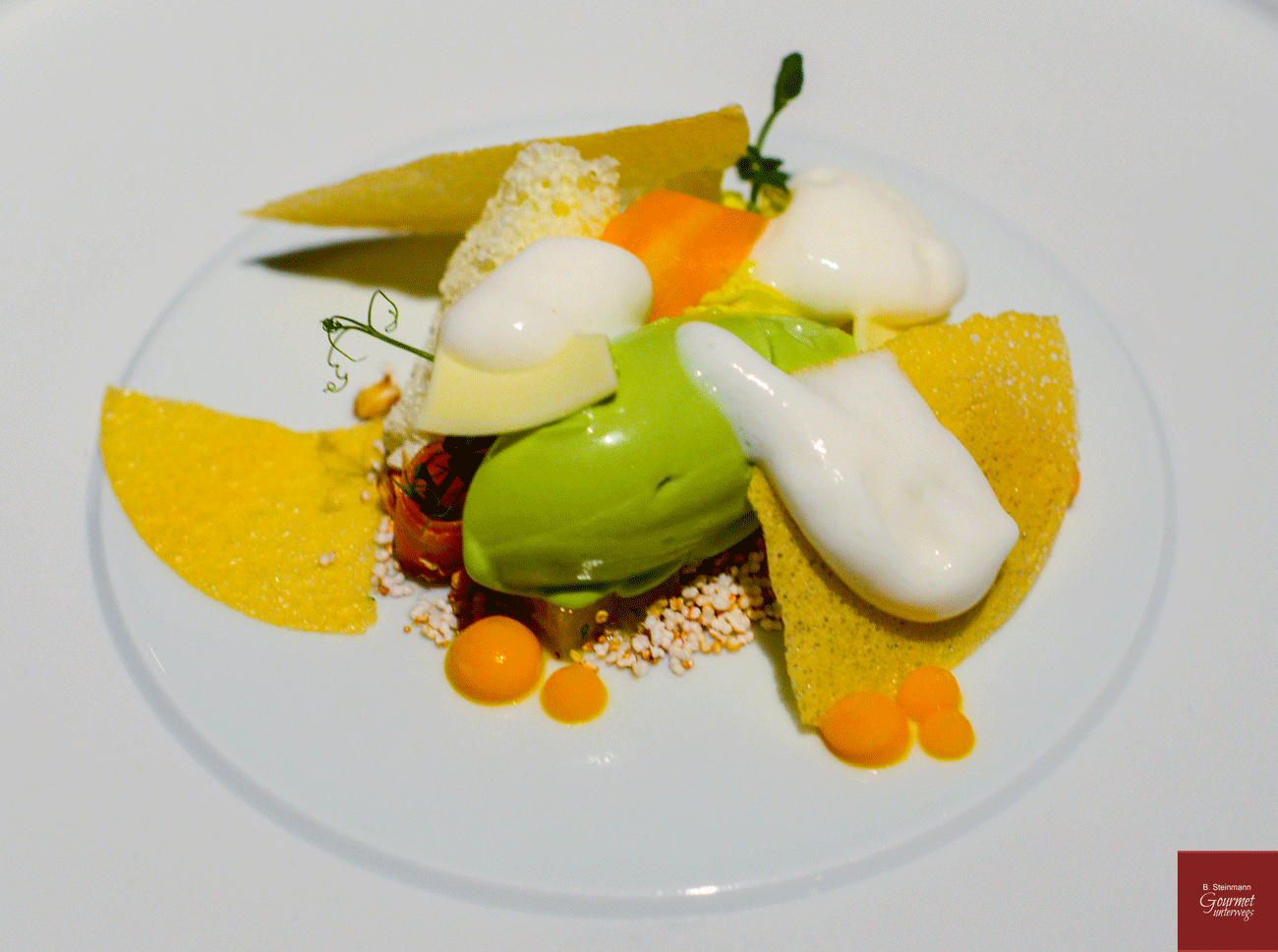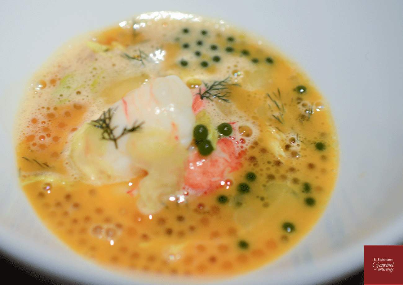 Aufmerksamen Betrachtern der Fotos ist natürlich nicht entgangen, dass Otto den Gerichten jeweils drei Tupfen Gel oder Creme zur Seite stellt, die nicht nur geschmacklich zum Gericht passen sondern eine weitere Bedeutung haben. Sie stellen sozusagen die Signatur Ottos dar und erhöhen den Wiedererkennungswert bei all den vielen Fotos im Netz. So wird es mir auf Nachfrage erklärt. Beim nächsten Besuch werde ich darauf nochmals zurückkommen.