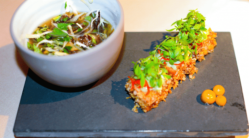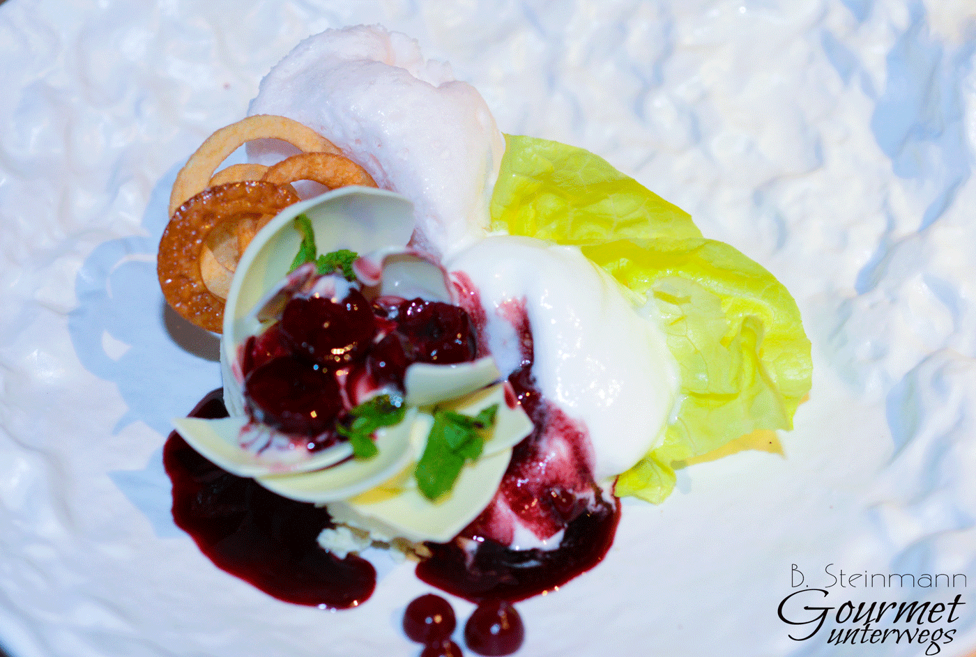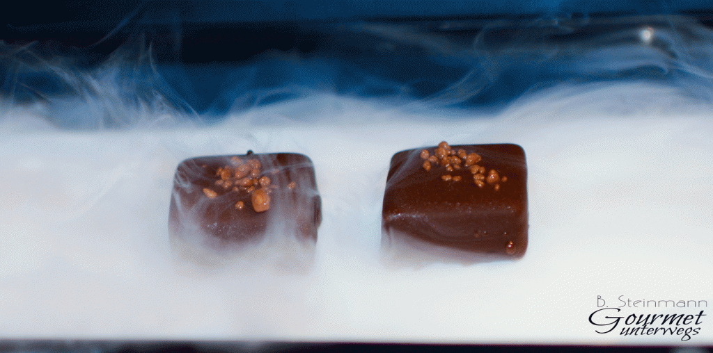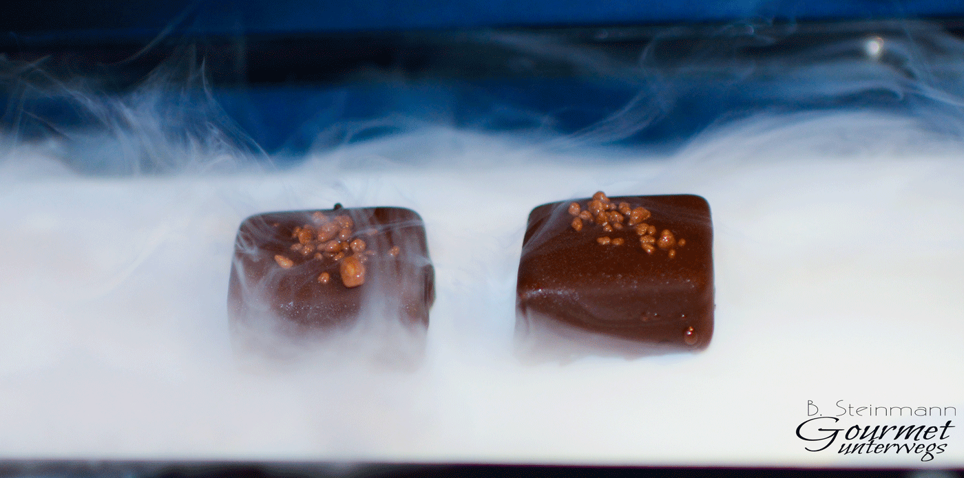 Meiner Meinung nach reicht die Ernsthaftigkeit der Küche bei der Gestaltung der Speisen, der Ideenreichtum, der sichere Umgang mit Geschmacksbildern und die Verwendung hochqualitativer Zutaten eigentlich aus. Der Versuch Küchendüfte mittels einer Kanne auf die Tische zu übertragen, das Spiel mit Stickstoff zur Präsentation von zwei Pralinen, konterkariert allerdings die bei den Speisen gezeigte Professionalität. Durch die visuelle Überfrachtung kann das Ganze leicht ins Banale abdriften. Das wiederum, würde Hendrik Otto nicht gerecht werden.