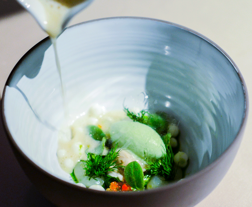 So ungefähr ist es auch mit der Entwicklung eines klassischen Gerichtes, wie der Gänseleber von Hendrik Otto. Wie ein Opernlibretto ist es mal schwerer, mal leichter verständlich, mal scheinen die Zutaten minimiert und eher nebensächlich, mal erkennt man Wiederholungen oder mehrere Komponenten, die auf verschiedenste Weise miteinander interagieren, wie in diesem Falle eine grüne Pfeffercreme mit Buttermich und Zwetschgenröster. Ottos Gänseleber ist immer wieder ein vortreffliches kulinarisches Erlebnis.