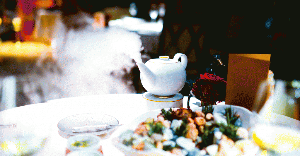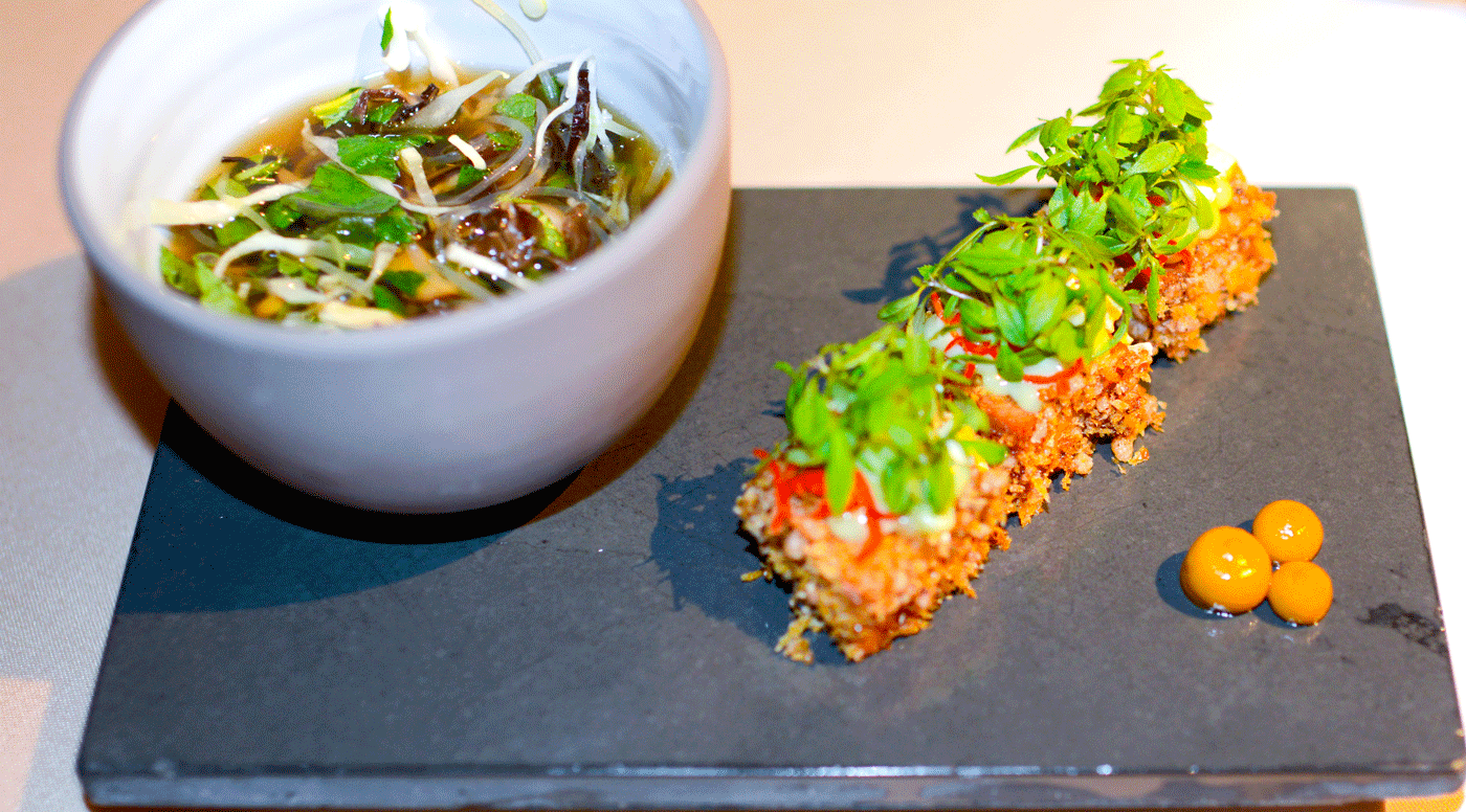 begleitet von gefrorenen Earl-Grey-Perlen und Ananaslimettensaft