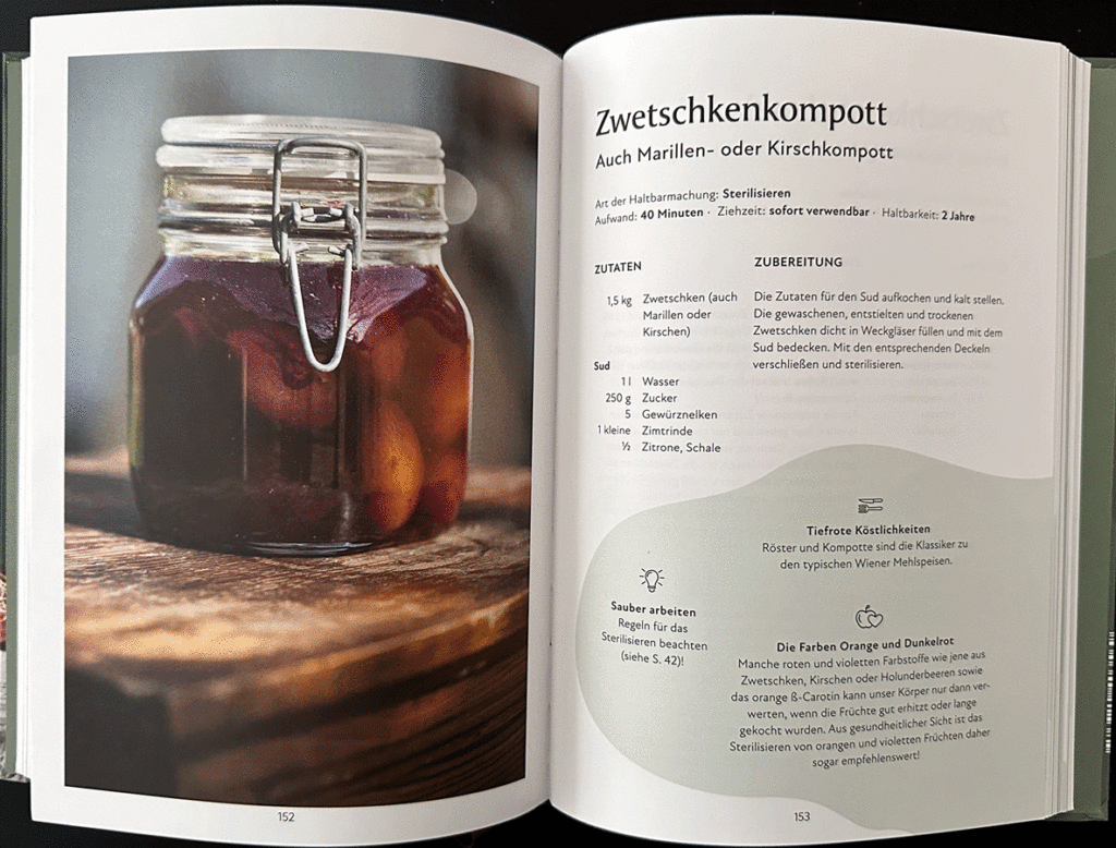 Auf über 250 Seiten gibt es praktische Ratschläge und anschauliche Rezepte. Mir persönlich hat es das Zwetschgenkompott angetan, das ich noch so deutlich aus meiner Kindheit in Erinnerung habe.