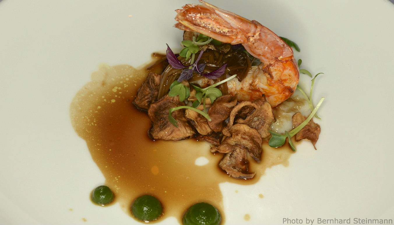 Wildwassergarnele, Topinamburcreme, Enokipilze, Sojareduktion
