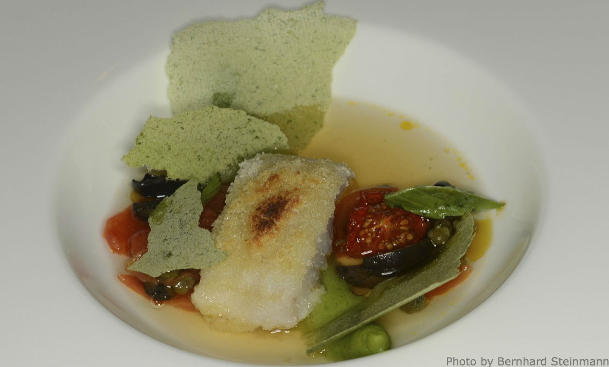 Der magere Knorpelfisch ist mit dem Hai verwandt und im Geschmack, na ja, eher unauffällig. Bei zahlreichen Gelegenheiten durfte ich diesen Raubfisch schon genießen. Markus Semmler begleitet den Rochenflügel mit einem Petersilienpüree und Petersiliencräckern. Die angegossene Tomatenessenz verleiht dem Gericht eine milde und elegante süße Note.