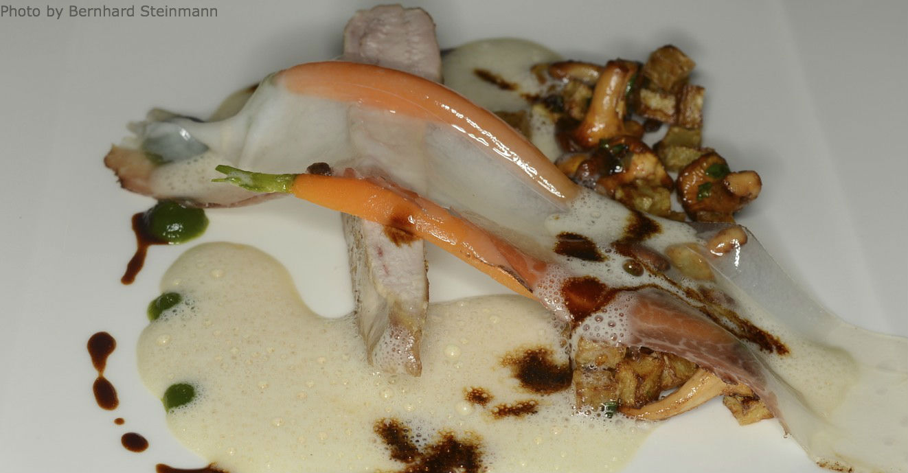 Erneut eine süße Note, diesmal von den Karotten und als Gegenpol die intensiven, leicht erdigen Pilze. Nicht nur der Optik wegen sind, äußert sparsam zwar, einige wohlschmeckende Schnittlauchtupfer (Creme) zur Begleitung auserkoren.