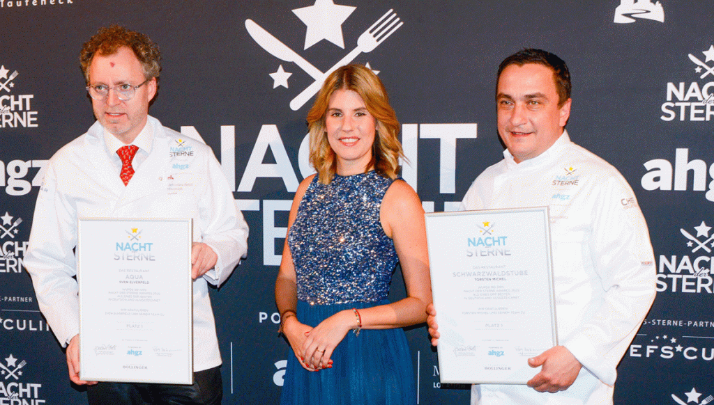 Wie bereits erwähnt, teilt sich Torsten Michel den ersten Platz, u.a. mit Sven Elverfeld aus dem „Aqua“ in Wolfsburg. In der Mitte die Moderatorin Felicitas Then.
