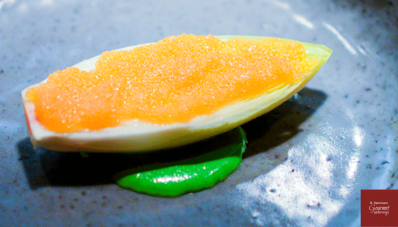 Die Fokussierung auf wenige, sehr wenige Bestandteile eines Gerichts findet seine Fortsetzung. Der Kaviar (Forellenkaviar?), mariniert in einem Rapsölauszug, wird auf einem rohen, bissfesten und mit deutlichen Bitternoten versehenen Chicoreeschiffchen serviert. Interessant, kreativ und schmackhaft.