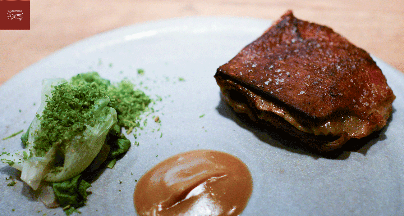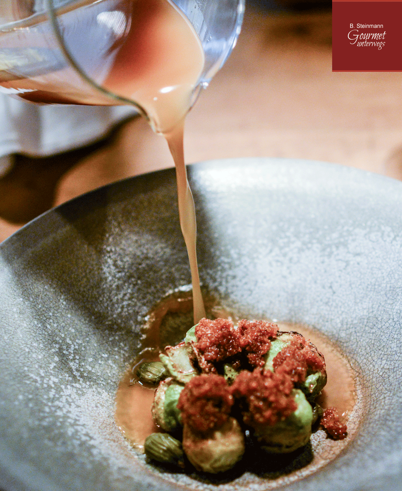 Nun wird noch ein Lammfond angegossen und ein beeindruckendes Gericht mit zarten Senfnoten lässt keine Wünsche offen.