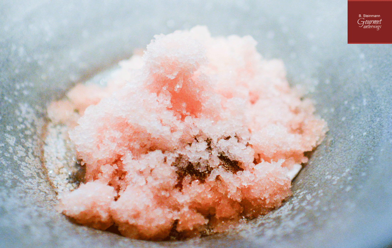 Das Aroniasorbet ruht auf eingekochter Sahne, deren Geschmack an Kondensmilch heranreicht. Der Johannisbeersaft mit den kräftigen Fruchtnoten ergänzt sich mit dem Baiser, welches nach Rosenblüte schmeckt.