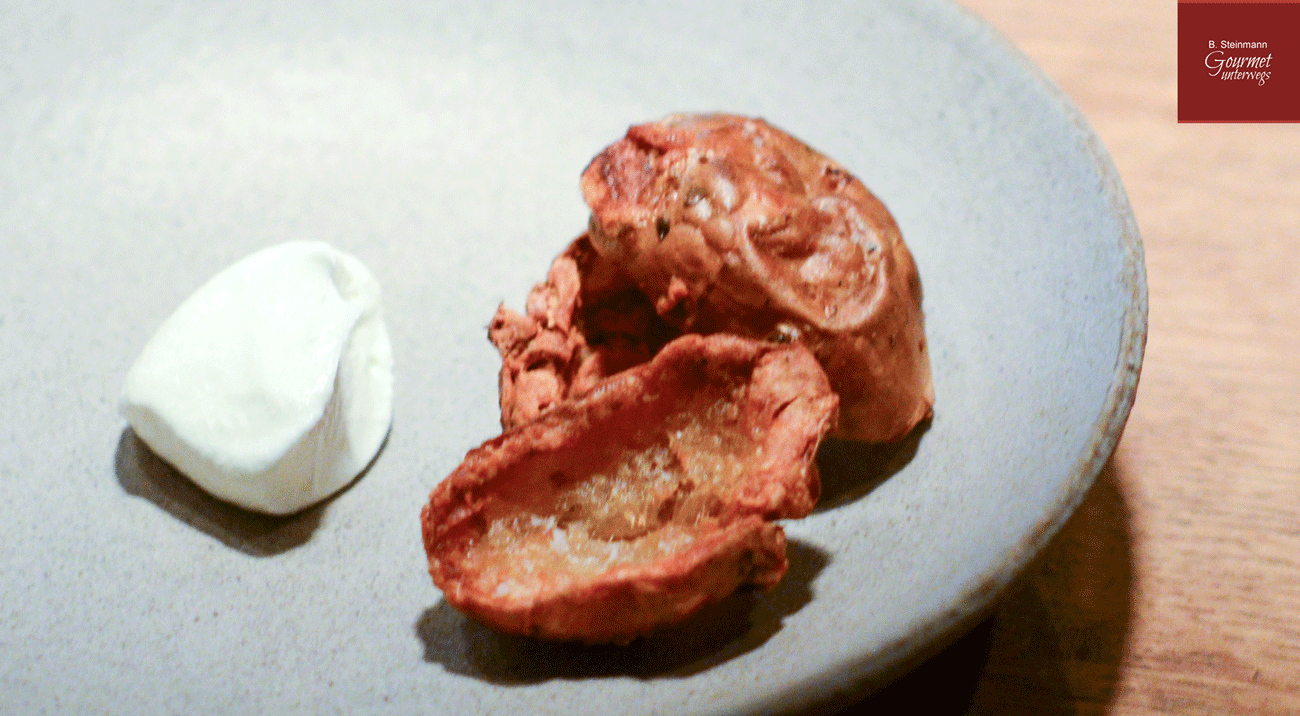 Die Knolle ist gebacken, leicht karamellisiert, außen kross und innen einem Püree ähnlich. Hinzu kommt ein cremiger Joghurt und fertig ist die puristische Kreation. Eine Kleinigkeit, die uns dennoch begeistert.