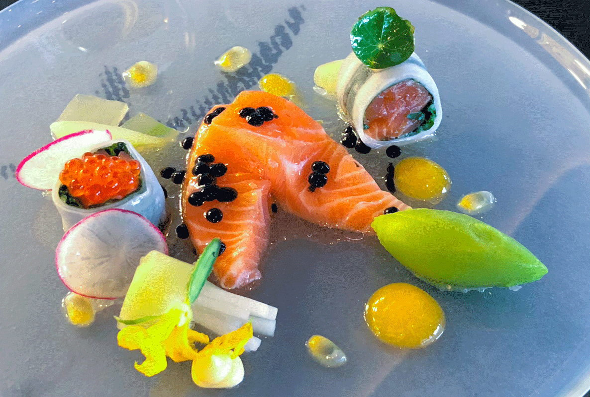 Label Rouge Lachs, roh-mariniert, Gurke, Passionsfrucht, Shiso, Grün, Soja
