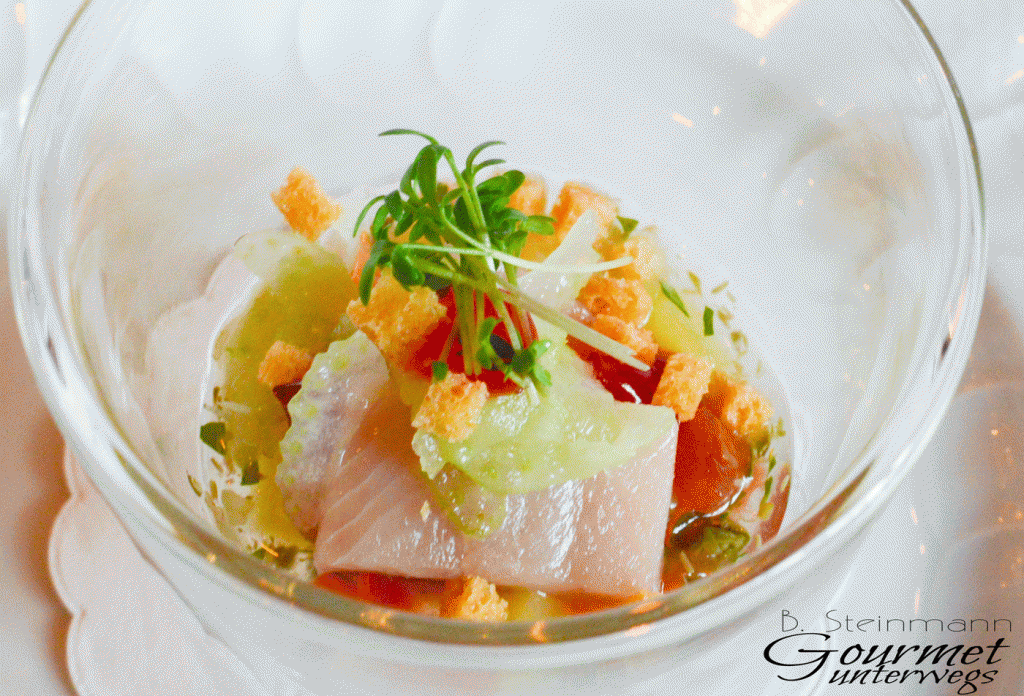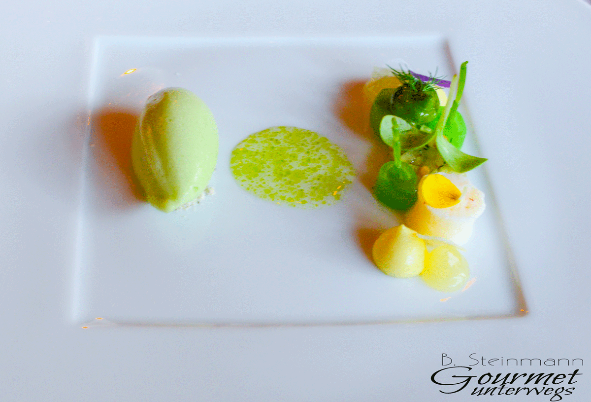 Zunächst erreicht uns ein erfrischendes Gurkensorbet mit Yuzu und Chiligurke, Buttermilchschaum mit Molke und Nouri-Algen. Jedenfalls, soweit ich mich erinnere.