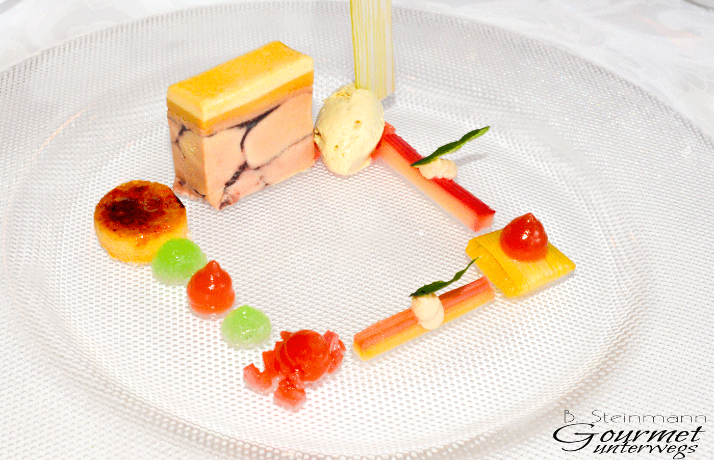 Variation von der Gänsestopfleber mit Waldmeister und Rhabarber