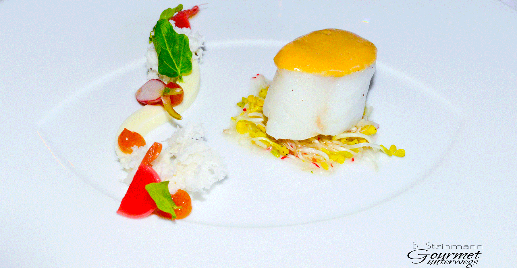Unter dem Fisch befindet sich eine Sprossenvinaigrette, eine Sauce hollandaise finden wir obenauf. Wir freuen uns über eine ausgesprochen gelungene Balance, die auch von den weiteren Begleitern eingehalten wird. Die Kombination ist feingliedrig und puristisch und geschmacklich vortrefflich.