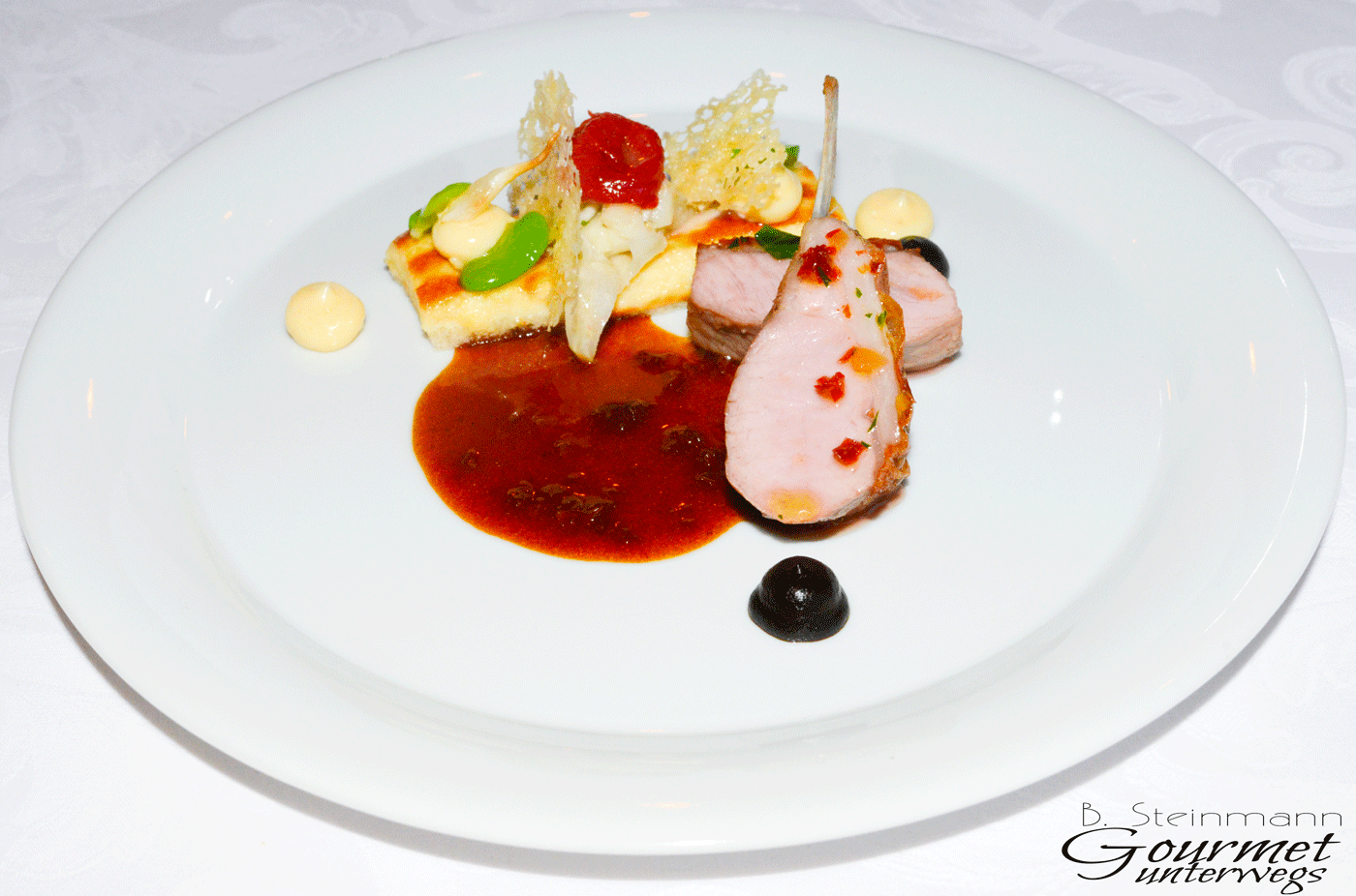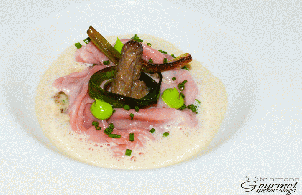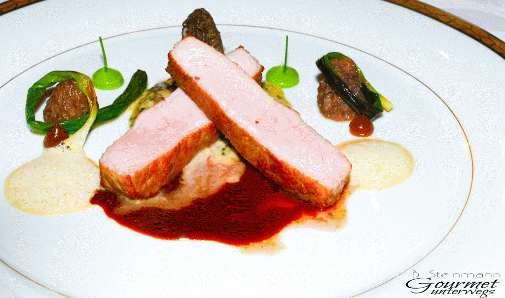 Bevor nun jemand die Menüfolge kritisiert, Milchkalbsrücken folgt auf Milchlamm, bedarf es des Hinweises, dass wir allein für die Zusammenstellung verantwortlich sind, da wir nach zuletzt reichlichem Genuss von Tauben unterschiedlichster Zubereitungsart, die angebotene Taube abgewählt haben.