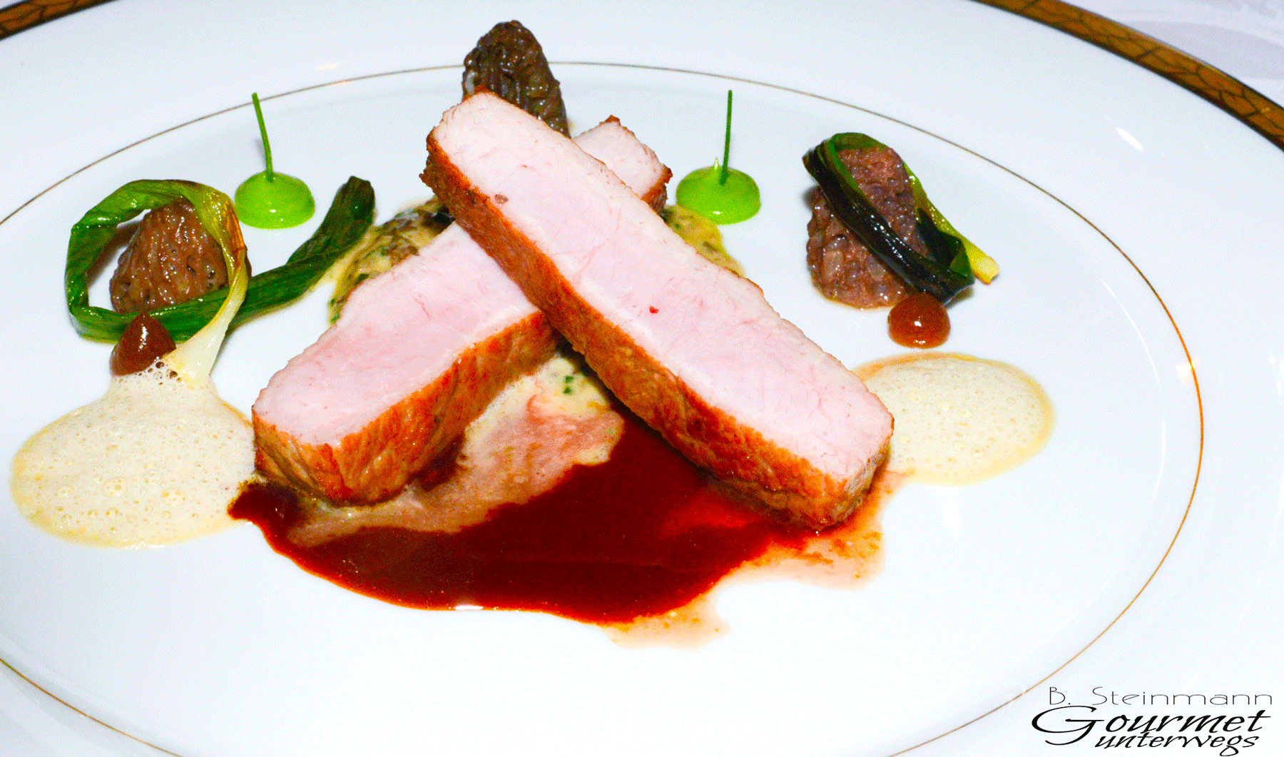 Gebratener Milchkalbsrücken mit glacierten Morcheln, jungem Lauch und Sherrysauce