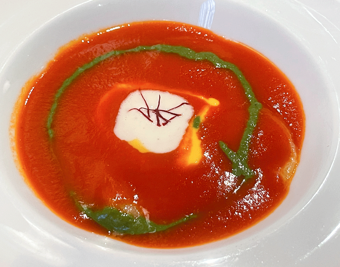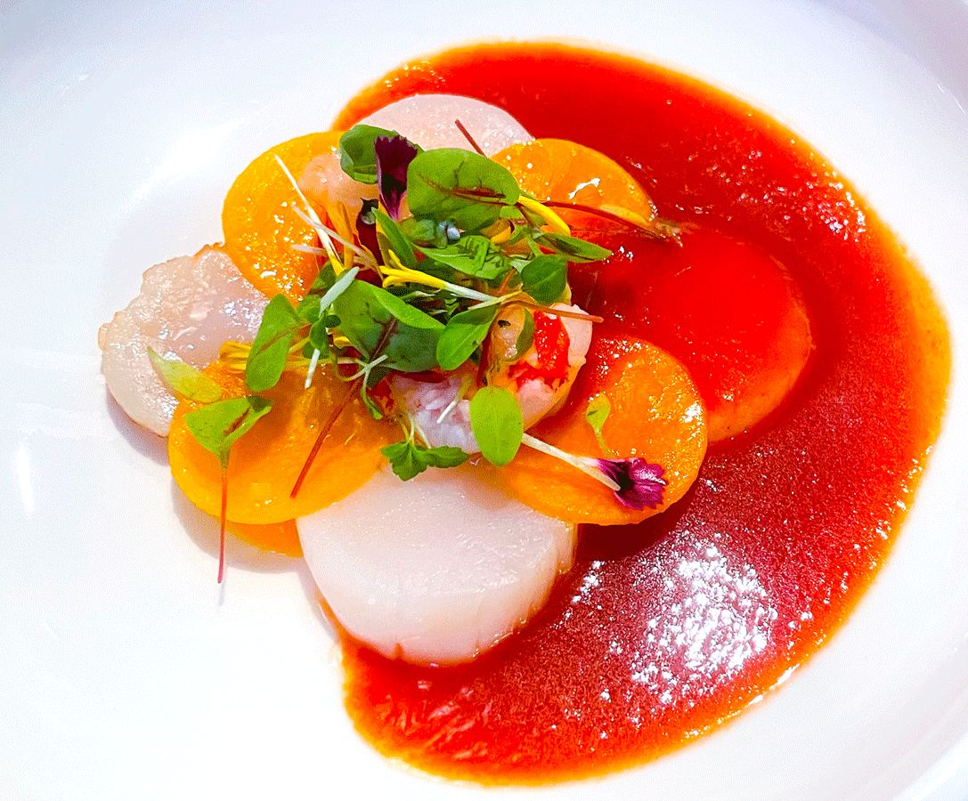 Gambero Rosso di Mazara, Jakobsmuschel, Kürbis und einer Krustentier-Jus.