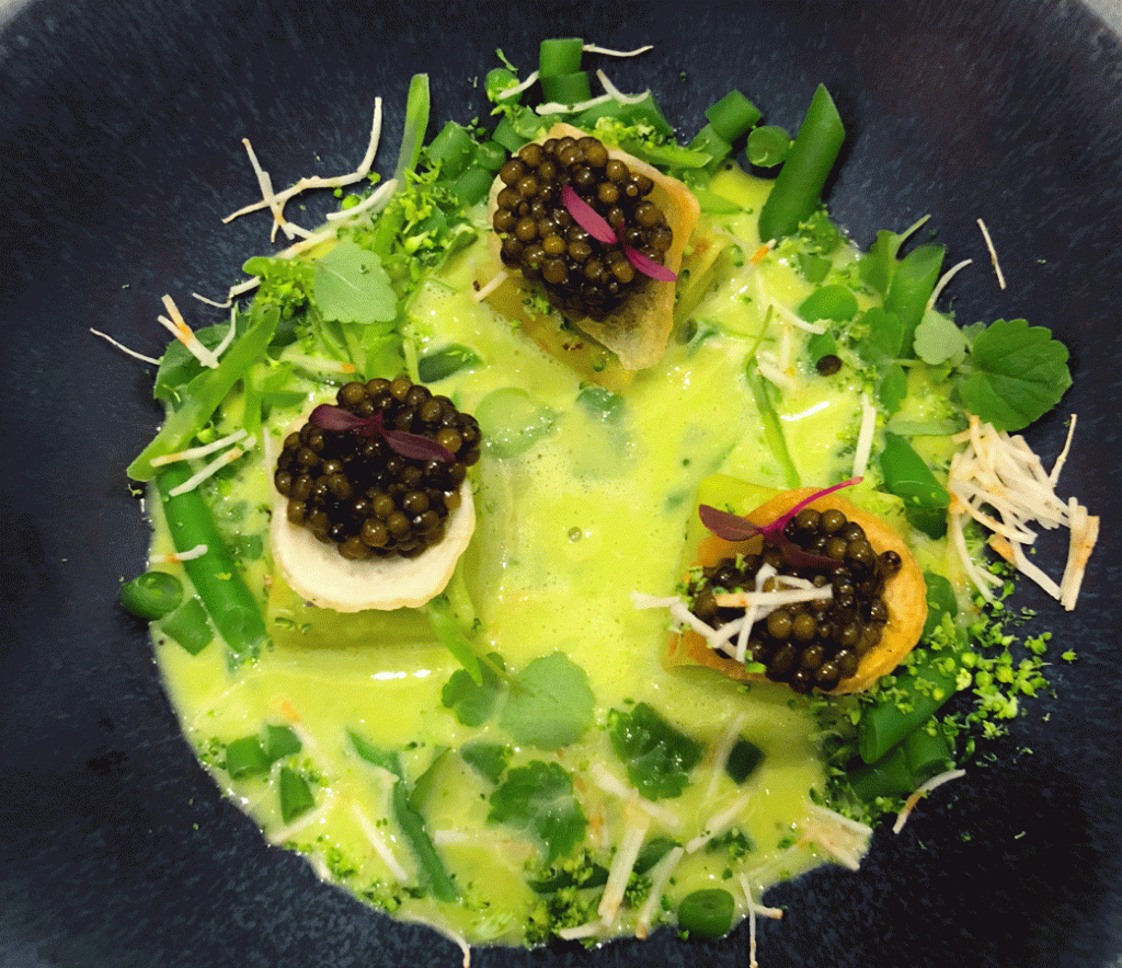 Leckerbissen von Parchemin-Bohnen aus der Genferseegegend, grüner Jus mit Ossietra-Kaviar verfeinert
