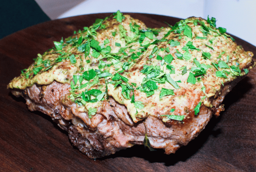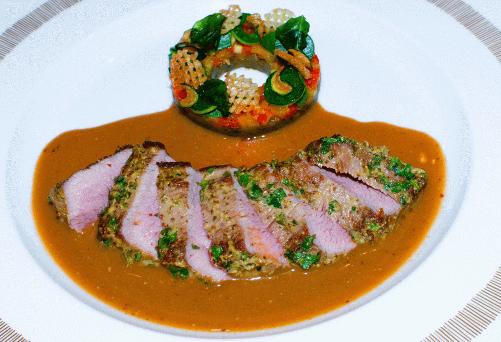 Lammrücken aus den Hautes-Alpes, gebraten mit frischen Kräutern aus Orny, confierte Zucchini und Auberginen mit Paprika