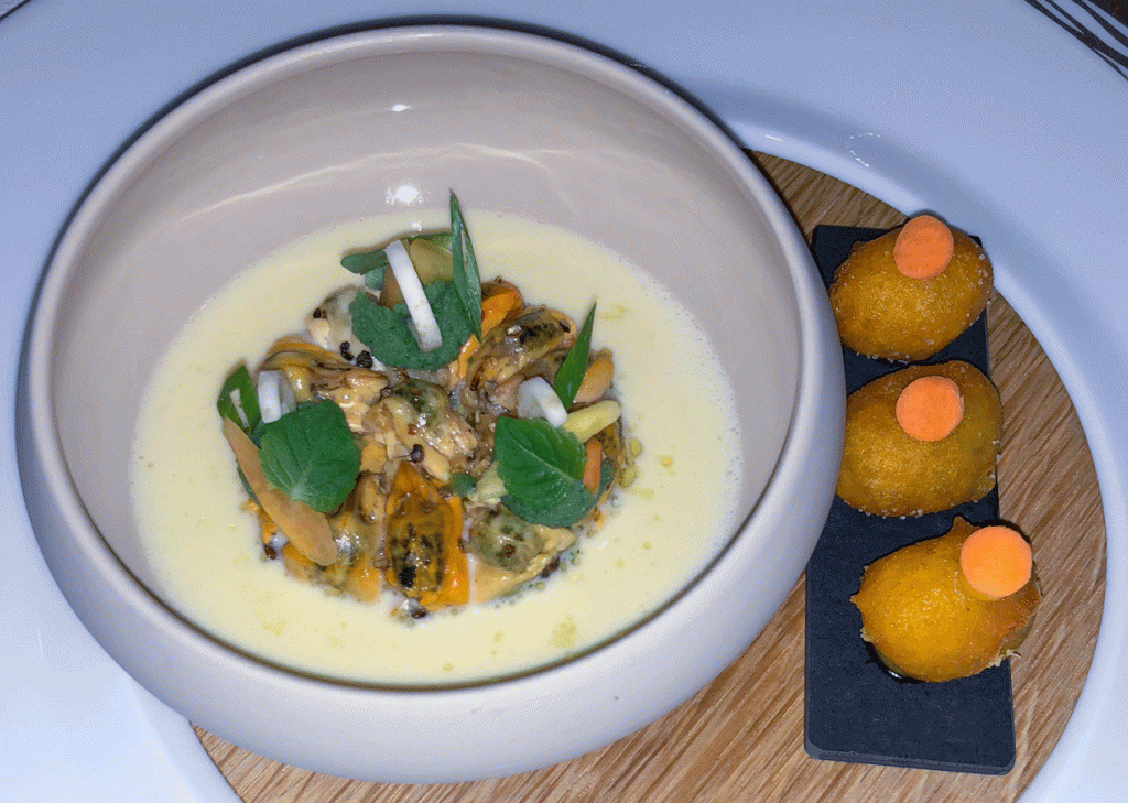 Leichte Nage von Miesmuscheln in Chasselas geöffnet, mit Safran vom Jorat parfümierte Krapfen
