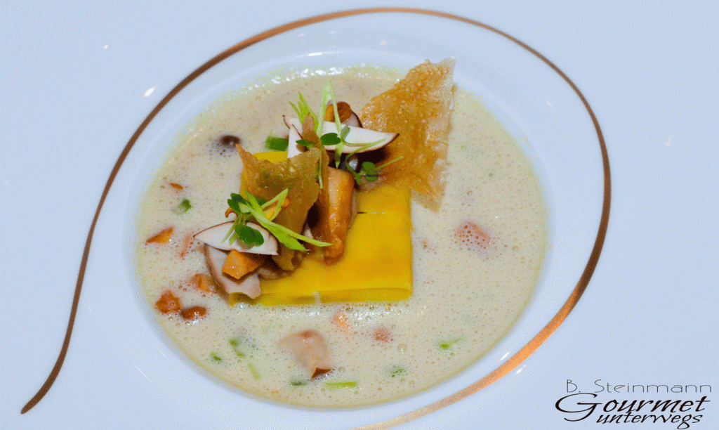 «Moelleux» von Steinpilzen und Pfifferlingen, abgelöscht mit einer Walliser Trockenbeerenauslese, knusprige Ziegel mit Sellerie
