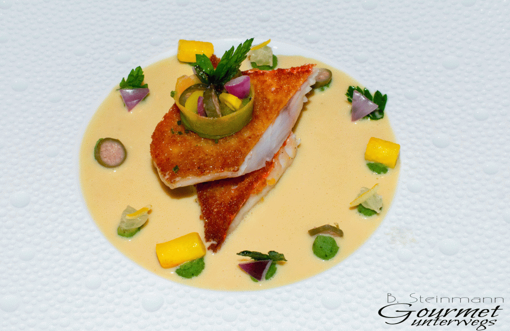 Filets der Streifenbarbe, scharf angebraten, begleitet von Kapernäpfeln, delikatem Fumet mit Zitrusfrüchten und Verjus von Féchy