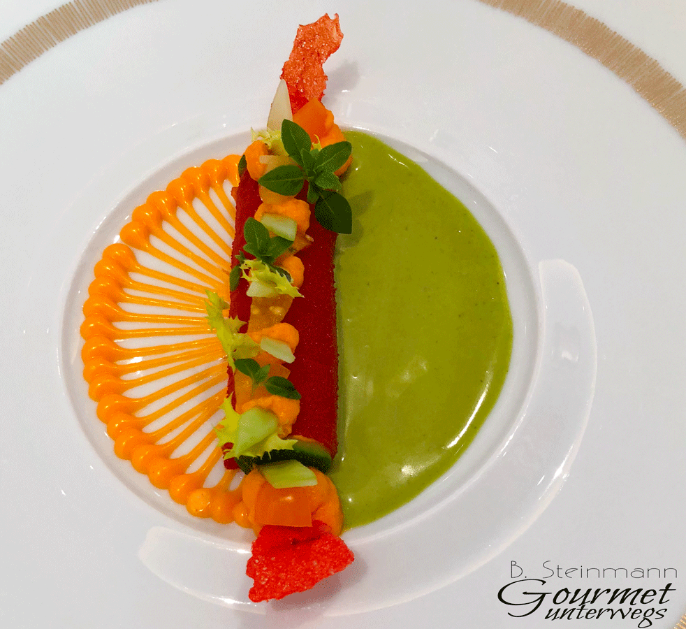 Welch ein Aufwand. Doch größer noch als der optische Eindruck ist das Geschmacksbild. Feine Tomaten, von wenigen Begleitern noch aufgewertet, beeindruckten uns ungemein.