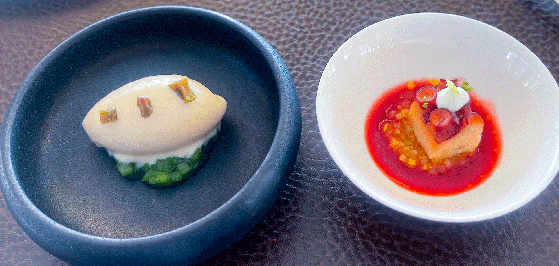 Der frische Blauflossenthunfisch stammt aus der Züchtung der Familie Balfegó, unweit von Tarragona im Nordosten Spaniens und ist von hervorragender Qualität. Zusammen mit der Litschi-Dashi-Koriander-Sauce taugt der Küchengruß bereits zur Vorspeise.