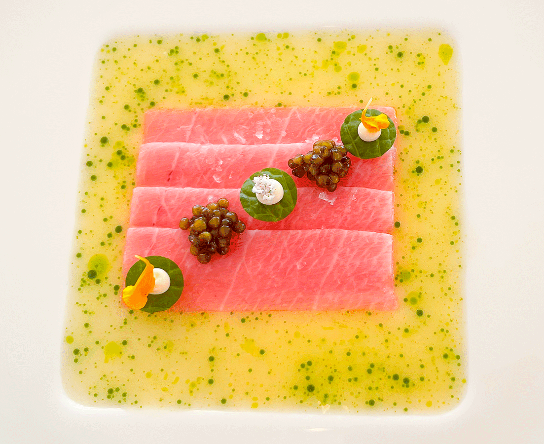 Balfegó-Thunfisch mit Litschi-Dashi-Koriander-Sauce
