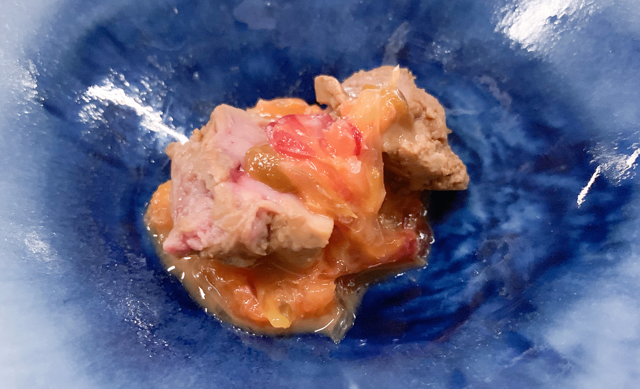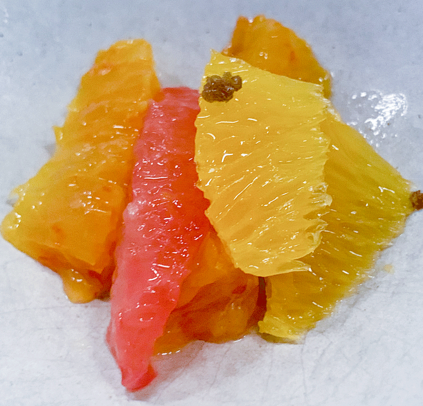 eingelegt in einem Mix aus Dashi, Sake und Soja. Blutorange. Ein überaus aromatisches Gericht.