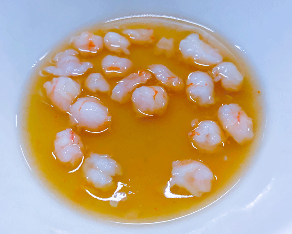 Die Shrimps werden am Kopf angefasst um den Schwanz in einem Gefäß mit Dashi einzutauchen. Danach wird der Schwanz in Zitrone eingetaucht und verzehrt.