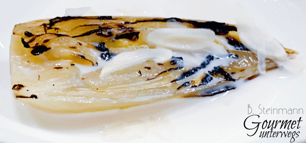 Chicoree,  gegrillt mit Molke und Mandeln.