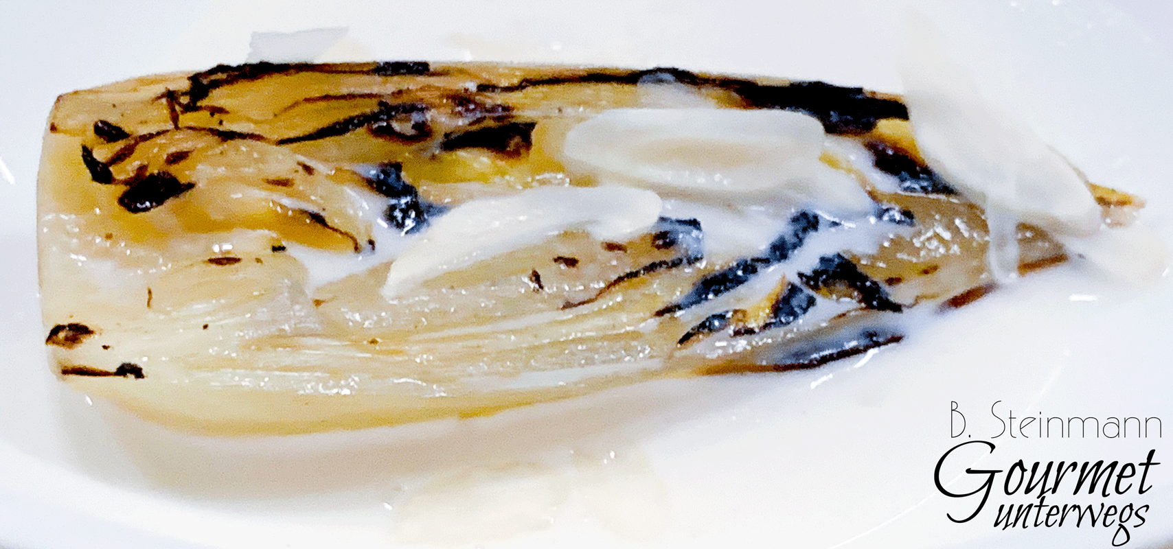 Leicht gegrillt und angereichert mit Speck vom Mangalitzaschwein. Hinzu kommt eingesalzener Jacobsmuschelrogen aus Norwegen.