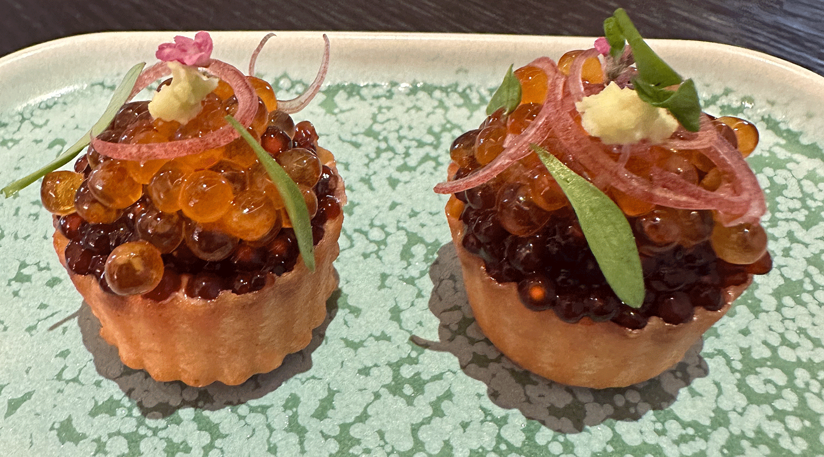 Buchweizen Crustate, Saiblingstatar, Kamebishi Sojasauce, Myoga & Wasabi