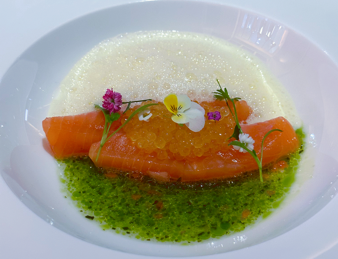 Schliersee Saibling, Combava, gebrannter Rahm & Dashi Beurre blanc