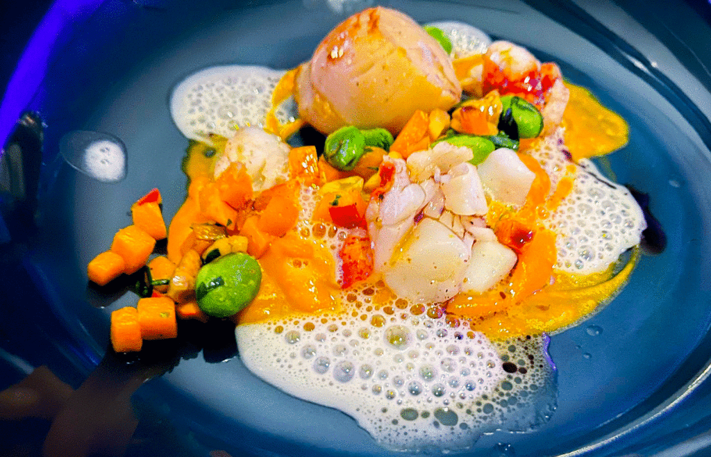 Jakobsmuschel und Hummer, Kürbis, Cashew, Sojabohnen, Kokos