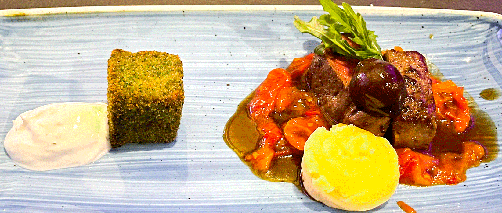 Lamm Orient – Okzident, rosa Rücken, Paprikagemüse, Borettane-Balsamicojus und geschmorte Keule, Ras el Hanout, Rosinen, Joghurt