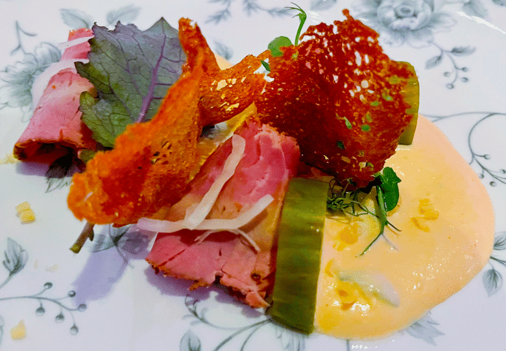 Schon als ich es auf der Karte gelesen hatte, war ich sehr interessiert. Pastrami ist in den USA äußerst populär. Es stammt ursprünglich wohl aus Rumänien und wurde mit der jüdischen Küche in die USA, vor allem in New York, eingeführt. Dort hatte ich vor langer Zeit schon das Vergnügen mit einem Pastrami Sandwich bei Katz’s Delicatessen, wo die weltberühmte Szene des Films Harry und Sally gedreht wurde. Sie erinnern sich?
