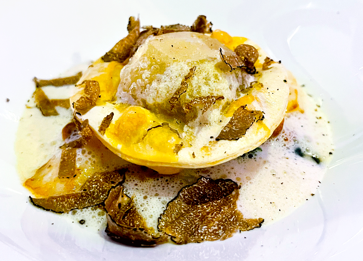 Steinbutt und Kalbskopfravioli, Spinat, Pilze, Trüffelsauce