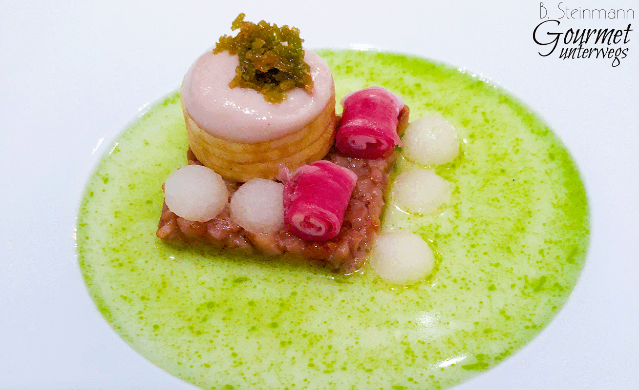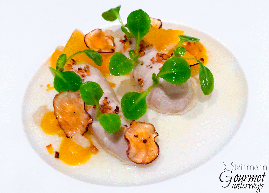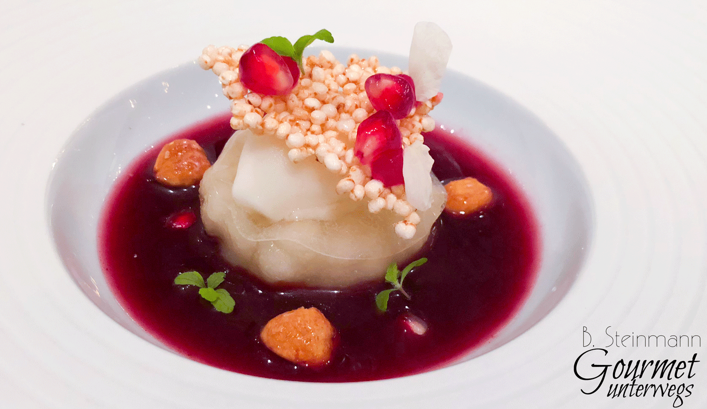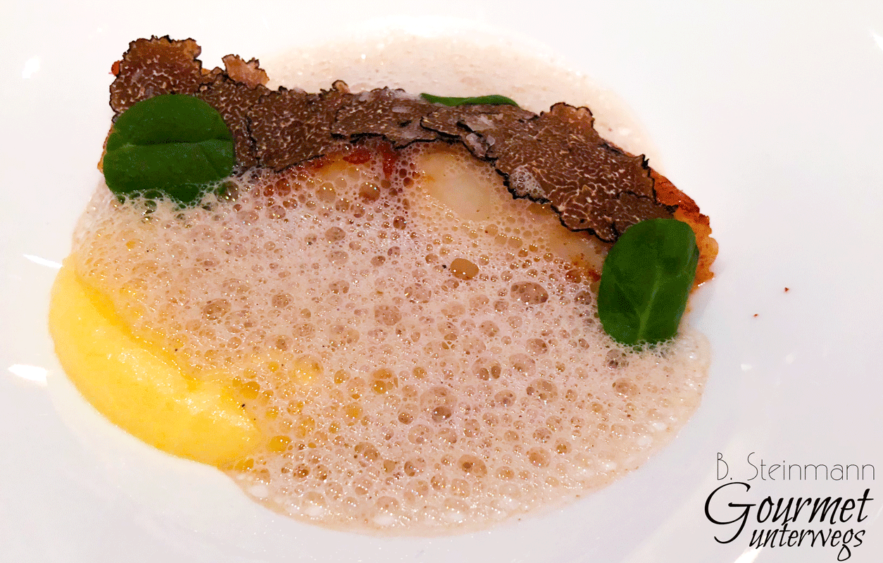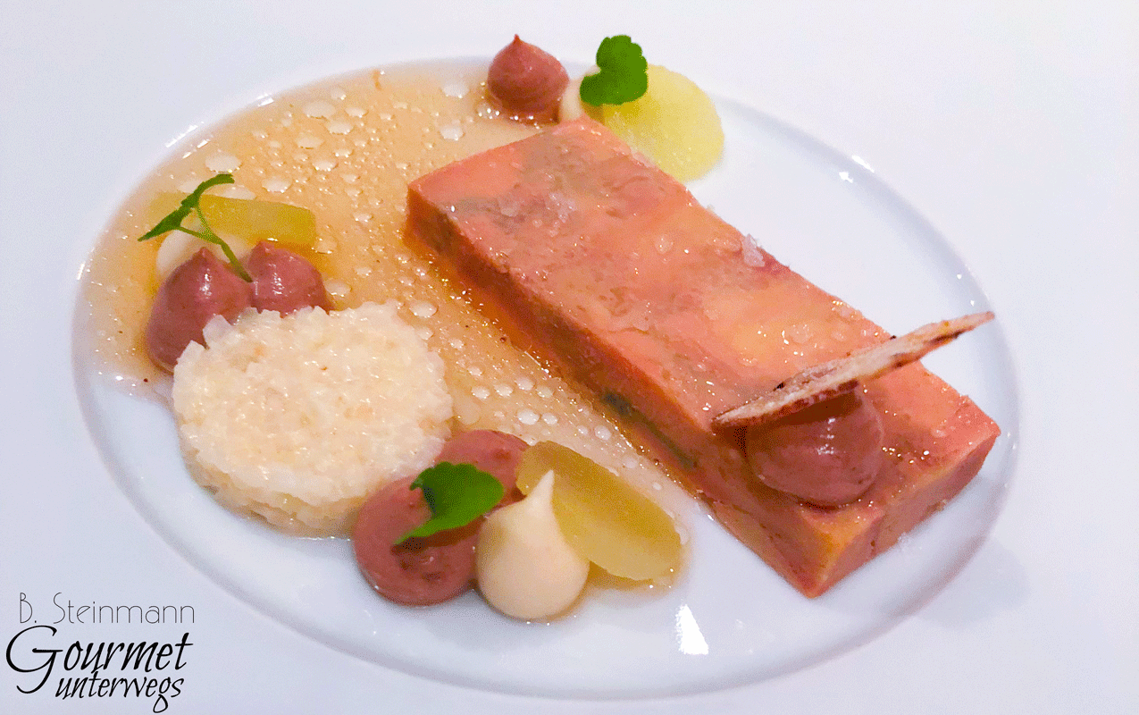 Was meine ich damit? Denke ich an Gänseleberkreationen von Claus-Peter Lumpp oder Pierre Gagnaire, die mit aromatischer Wucht und Opulenz zu begeistern suchen, so zeigt Rommels Kreation, dass man auch mit leisen Tönen hervorragend kombinieren kann.