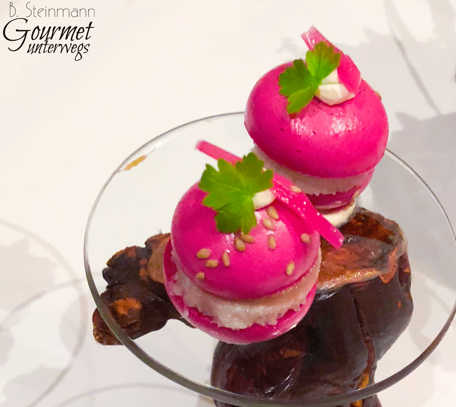 Rote Bete Macaron mit geräuchertem Aal und Granny Smith Apfel