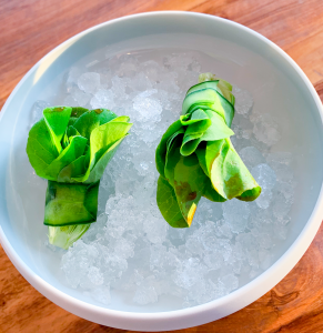 Der Salat liegt auf Eis, der Dip geschmacklich eher neutral. Die zarten und weichen Blätter lassen die Frische besonders deutlich spüren.