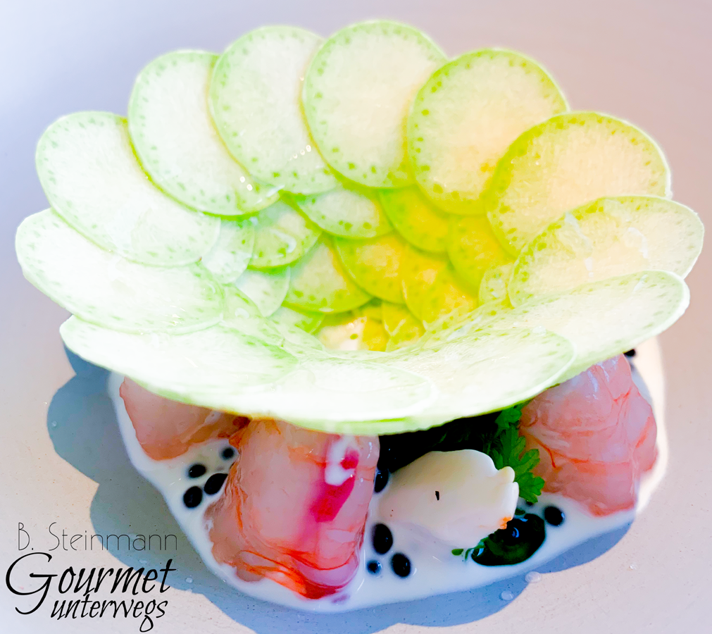 Das Gericht ziert ein extravaganter Hut aus Zucchinischeiben, der fast Ascot tauglich erscheint. Ansonsten ist das Gericht eher durchschnittlich, wobei der verwendete Kaviar eindeutig nach oben zeigt.