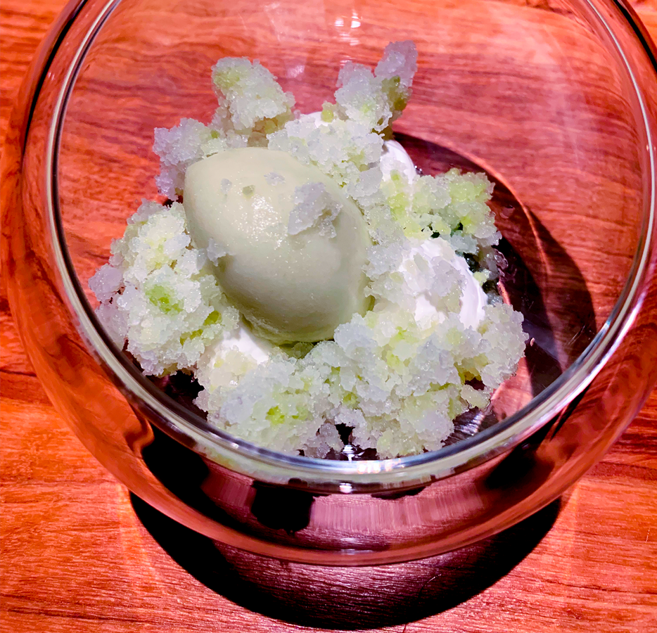 Gurkeneis und Apfelgraniteé, Joghurt, Zitronenespuma, Apfelcreme